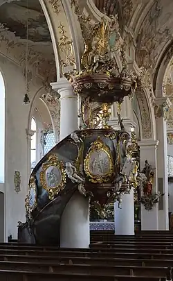 Johann Wilhelm Hegenauer schuf die Rokoko-Kanzel von 1745. Medaillons der vier Evangelisten verzieren die Treppenbrüstung. Die drei Reliefmedaillons am Kanzelkorb zeigen Szenen aus dem Leben Johannes des Täufers. Ein Putto am Kanzelkorb verweist auf die Zehn Gebote, ein anderer darauf, dass hier verba vitae aeternae, Worte des ewigen Lebens, verkündet würden. Ein Putto mit Kreuz verweist darauf, dass Worte des gekreuzigten Jesus verkündet werden, ein weiterer mit Augenbinde darauf, dass ein Mensch, der Gottes Wort nicht hört, einem Blinden gleiche.[17]