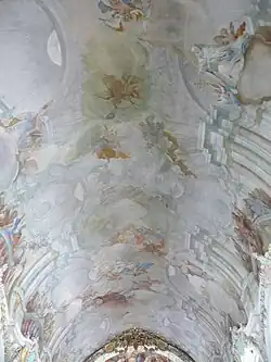 Im Deckenfresko über dem Hochaltar ist die Geburt Christi mit der Anbetung der Hirten dargestellt. In der Flachkuppel des Chors gibt sich Christus in der Kommunion den Aposteln zur Speise. Am unteren Rand sind die Allegorien von Glaube, Hoffnung und Liebe dargestellt sowie die Unschuld mit einem Einhorn. In den Zwickeln halten Engel Bänder mit Texten aus der Hymne Tantum ergo. Links über den Oratorien ist die Himmelfahrt Christi und rechts die Herabkunft des Heiligen Geistes zu sehen.[18]