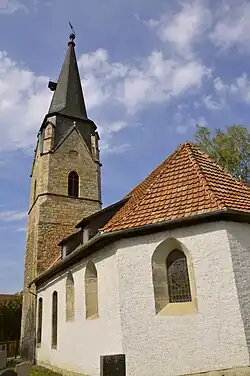 1296 wurde eine Kirche erstmals erwähnt. Die heutige Saalkirche, aus Bruchsteinen erbaut, wurde auf den Grundmauern eines Vorgängerbaus aus dem 15. Jahrhundert 1697 fertiggestellt, wie eine Inschrift an einer Fensterbank belegt. Das Langhaus hat einen dreiseitigen Abschluss des Chors und einen eingezogenen Kirchturm im Westen. Der Chor hat spitzbogige Fenster, ebenso das Langhaus an der Südseite. An der Nordostwand befindet sich eine spitzbogige Blende aus dem Vorgängerbau. Im Jahr 1847 wurde der Kirchturm aufgestockt, gut zu erkennen am Wechsel des Mauerwerks etwa in halber Höhe des Turms. Das war leichtsinniges Unterfangen, da das Fundament hierfür nicht ausgelegt war. Der Turm erhielt eine neugotische Form und einen hohen verschieferten oktogonalen spitzen Helm. Ferner erhielt der Turm einen Anbau. 1874 erfolgte eine grundlegende Instandsetzung der Kirche.