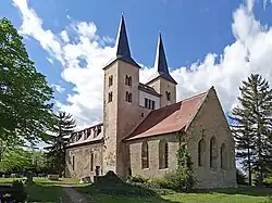 Das Kirchenschiff und die ehemals vermutlich das Westwerk des Vorgängerbaus bildenden Kirchtürme wurden im 12. Jahrhundert aus einem Quadermauerwerk aus Travertin errichtet. 1785 wurde das Kirchenschiff neu als verputzter Travertinbau mit Mansarddach und Dachgauben errichtet, die Türme blieben aber weitgehend im bauzeitlichen Zustand erhalten. Die beiden obersten Geschosse der schlanken Türme waren ursprünglich durch je ein Biforium aus Säulen mit Würfelkapitell nach jeder Seite geöffnet. Diese sind jetzt z. T. zugemauert oder durch den neuzeitlichen Turmzwischenbau verdeckt. Um 1825 wurden die Hauben der Türme wegen Baufälligkeit abgetragen, die Türme wurden aber entgegen dem Willen der Kirchgemeinde nicht abgerissen, so dass die Turmhauben 1855 in der gegenwärtigen Form wiederhergestellt werden konnten.