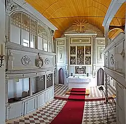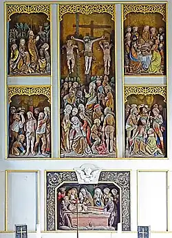 Von der mittelalterlichen Kirchenausstattung sind nur noch die Teile zweier Altarretabel erhalten. Die sechs spätgotischen geschnitzten Reliefs mit Szenen der Passion, dem Kalvarienberg und der Grablegung Christi wurden bei der Neuausstattung im frühen 19. Jahrhundert in den Altarprospekt eingefügt. Die kleineren Reliefs wurden vielleicht in nachreformatorischer Zeit überarbeitet oder nachgebildet. Von einem anderen Altar stammt ein Flügelpaar mit acht geschnitzten Heiligenfiguren auf den Innen- und zwei Gemälden mit Höllenfahrt und Auferstehung Christi auf den Außenseiten. Die Gemälde sind Anfang des 16. Jahrhunderts entstanden. In der Nordostecke des Chores steht ein dreiseitiges steinernes Sakramentshaus mit vier derben Heiligenreliefs, das um 1470/80 entstanden ist. Ein großes achtseitiges Taufbecken mit konkaven Seitenflächen aus dem 15. Jahrhundert steht heute auf dem Kirchfriedhof.