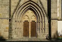 Im Westen ist ein Gewändeportal mit Steilgiebel und Krabbenbesatz mit einer zweiteiligen Maßwerköffnung angeordnet. Das Gewände wird durch Birnstabprofile in vier tiefe Kehlen gegliedert, die Figurenbaldachine sind heute leer. Das barocke Hauptportal ist zwischen den beiden südlichen Seitenkapellen angeordnet. Der Turm und hervorgehobene Partien des Außenbauwerks zeigen Mauerwerk aus Sandsteinquadern. Im Jahr 1977 wurden an der Südseite des Chores Reste der originalen Fassung entdeckt, die Figuren vor einer Häuserreihe und Inschriften zeigt.