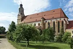 Nach Grabungen im Jahr 1977 wurde ein Saalbau mit eingezogener Apsis aus den Jahren nach 1034 als erster Vorgängerbau bestimmt. Das heutige Bauwerk wurde nach einer Inschrift am Chor ab 1359 als hochgotische dreischiffige Basilika mit einschiffigem Chor erbaut. Heinrich Hirsel wurde 1379 als Baumeister bezeugt. Der Kirchenraum wurde um 1407 und der Turm Anfang des 16. Jahrhunderts vollendet. Im Jahr 1652 erfolgte eine erste Barockisierung unter Leitung von Francesco Garbaninis. Im Jahr 1672 wurde die Sakristei vergrößert. Im Jahr 1675 wurde die Kreuzkapelle, 1695 die Marienkapelle durch Wolfgang Dientzenhofer und 1754 die Schutzengel- und Aloisiuskapelle angebaut. In den Jahren von 1718 bis 1723 wurde eine umfassende Barockisierung durchgeführt, bei der eine Stuckierung durch Johann Baptist Zimmermann erfolgte; danach um die Jahrhundertmitte wurden die Seitenkapellen durch seinen Neffen Anton Landes stuckiert und eine Ausmalung wurde durch Johann Adam Müller vorgenommen. Eine Gesamtrestaurierung erfolgte in den Jahren von 1977 bis 1984.