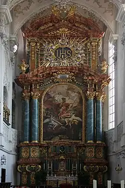 Die reichhaltige Ausstattung wurde größtenteils durch den Jesuitenpater Johann Hörmann († 1699) konzipiert. Der mächtige Hochaltar aus dem Jahr 1695 hat eine ausladende Sockelzone. Das Bild des Hochaltars mit einer Darstellung der Glorie des heiligen Georg wurde 1766 von dem Münchner Hofmaler Johann Nepomuk Schöpf geschaffen. Die beiden Seitenaltäre von 1669 sind mit je zwei Säulen ausgestattet. Das Altarblatt am nördlichen Seitenaltar zeigt den heiligen Ignatius, das am südlichen den heiligen Franz Xaver, beide wurden von Caspar de Crayer geschaffen. Der Kreuzaltar in der nordöstlichen Kapelle zeigt die Kreuzabnahme Christi und wurde vermutlich gleichzeitig mit dem Hochaltar von Caspar de Crayer geschaffen. Am Marienaltar gegenüber von 1695 ist Maria Immaculata dargestellt, die 1695/1697 von Johann Andreas Wolff geschaffen wurde. Im Tabernakel steht das Gnadenbild aus dem Kloster Kastl einer Muttergottes als Halbfigur, ein niederländisches Tafelbild aus der zweiten Hälfte des 15. Jahrhunderts, das wegen seiner Beschädigung im kalvinistischen Bildersturm als Maria, der in den Flammen unversehrte Dornbusch bezeichnet wird.