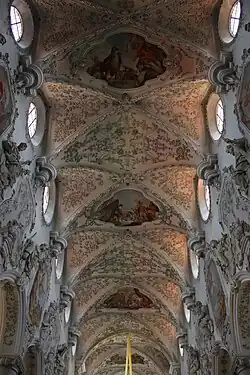 Der Gesamteindruck des in den Proportionen gotischen Raumes wird durch die Stuckdekoration bestimmt, die sich über die ursprünglichen Gliederungselemente wie Pfeiler, Arkadenbögen, Konsolen und Rippen legt und den vorhandenen Gewölbefeldern angepasst ist. Die Proportionen (die Höhe und Breite des Chors sind die gleiche wie die des Mittelschiffs, das doppelt so hoch und sechsmal so lang wie breit ist) wurden durch Zimmermann durch eine unterschiedliche Gliederung in beiden Raumteilen bewältigt: im Chor ist eine vertikal ausgerichtete Pilastergliederung, im Langhaus eine horizontale Ausrichtung der Stuckdekoration und der Gemäldefelder zu finden.