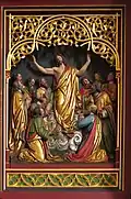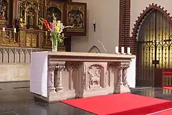 - Der monumentale Hochaltar wurde geteilt, das Unterteil (die Mensa) mit einem biblischen Sujet bildet seither den Altartisch. Als neue Mensa dient ein angefertigter mit einfachem Ornamentband verzierter Kunststein. Der Fußboden des Altarraumes erhielt große quadratische Schieferplatten.[16]