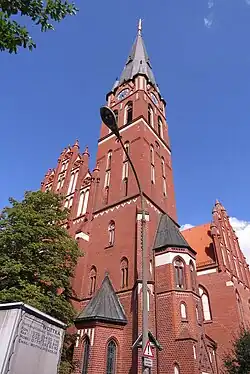 Das stattliche Kirchengebäude im Stil einer Backsteinbasilika und in Formen der Neogotik weist einen kreuzförmigen Grundriss auf und schließt mit einem polygonalen Chor. Es ist 37,60 Meter lang, 23 Meter breit und hat eine Gewölbehöhe von 15 Metern.