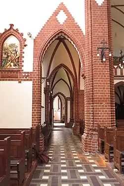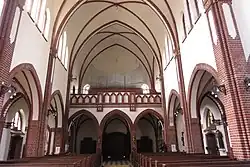 Das Kircheninnere wird von einem Kreuzrippengewölbe überspannt. Alle Wände waren bei der Kirchenweihe großflächig ornamentiert, aufgetragen vom Berliner Kunstmaler F. Busch.[28] Erst seit Ende der 2010er Jahre sind sie geweißt, lediglich die Rippenbetonung durch die Klinker wurde beibehalten.