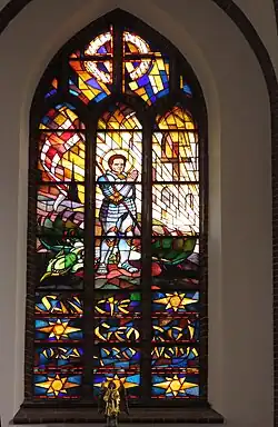 An der Wand zwischen dem südlichen Seitenschiff und der Vierung ist auf einem Wandvorsprung ein lebhaftes Relief des Kirchenpatrons zu sehen. Es zeigt den reitenden Georg in Rüstung und mit einer Lanze für den Kampf gegen den Drachen, angefertigt vom Künstler Peter Paul Müller aus Pankow.[32]