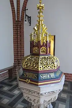 Im Zugangsbereich zur Taufkapelle steht die Skulptur des Apostels Johannes mit Buch und Schreibgerät in den Händen. Auf dem Podium vor der Kapelle ist das Taufbecken aufgestellt, dessen hölzerner zierlich geschnitzter Deckel bunt und golden bemalt ist. Die dreiseitige Taufkapelle erhält durch drei ornamentierte Spitzbogenfenster ihr Tageslicht.