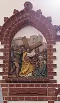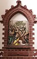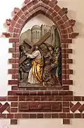 An den Giebelwänden und an den westlichen Wänden des Querschiffs befinden sich geschnitzte farbige Reliefs der 14 Kreuzweg-Stationen, die aus der Werkstatt der Firma Bogenheim aus Frankfurt am Main stammen. Der Kreuzweg wurde am 22. März 1912 geweiht.[31] Alle Bildnisse sind mit bogenförmigen wuchtigen Backsteinrahmen gefasst, die ursprünglich nach der Liturgiereform abgebaut werden sollten. In den 2010er Jahren nahm der ortsansässige Bildhauer Nikolaus Bode eine vorsichtige Säuberung der Reliefs vor.