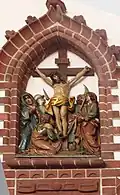 An einem Strebepfeiler an der Gebäudeecke Kissingenstraße/Kissingenplatz war eine überlebensgroße Sandsteingruppe mit der Darstellung einer Kreuzigungsgruppe angebracht. Die Figuren entstanden in der Werkstatt des Bildhauers Peter Paul Müller. Die Skulpturen der Mater Dolorosa und des Hl. Johannes, erst im Jahr 1942 hinzugefügt, wurden im Jahr 1980 gestohlen und nicht wieder ersetzt.[20][21]
