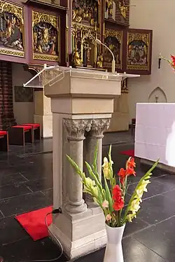 Die frühere Kanzel wurde abgebaut und ein Ambo aus Kunststein aufgestellt, der die Gestaltung des Altartisches aufnimmt.