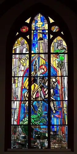 Alle sieben Spitzbogenfenster haben drei spitzbogige Bahnen, deren mittlere überhöht ist, und je zwei kleine Kreise im Bogenfeld. Die Glasfenster wurden 1965–1967 nach Entwürfen von Will Torger von den Glaswerkstätten K. Lendenroth gefertigt[16] und verleihen dem hellen Kirchenraum mit ihrer Leuchtkraft eine starke Ausstrahlung: Das östliche Altarfenster zeigt Gott in seiner Trinität, links die Schöpferhand Gottes mit Tieren, Pflanzen, Sternen und dem Menschen, zentral den Gekreuzigten mit Abendmahlskelch und Brot und rechts die Geisttaube mit dem Kreiskreuz. Die Zungen stehen für das Pfingstereignis und den Verkündigungsauftrag an die Apostel.[17] Auf dem Tauffenster über dem Taufstein an der östlichen Südseite ist die Taufe Jesu im Jordan durch Johannes den Täufer dargestellt. Das Kanzelfenster gegenüber hält den predigenden Jesus vor Augen, während die drei Personen für drei unterschiedliche menschliche Typen und Reaktionen stehen: Ablehnende, Nachdenkende und Annehmende.[18] Das Gethsemanefenster zentral im Süden zeigt den betenden Jesus im Bewusstsein seines nahenden Todes und hinter seinem Rücken die schlafenden Jünger. Das gegenüberliegende Georgfenster ist dem Heiligen Georg – Namensgeber der Kirche seit Anfang des 13. Jahrhunderts – im Kampf mit dem Drachen gewidmet, der auf dem Pferd gegen den Drachen kämpft. Seine Lanze trägt das Kreuzzeichen und die Fahne das Christus-Monogramm IHS. Auf der Orgelempore an der westlichen Südseite befindet sich das Davidfenster. Auf der rechten Seiten ist David als Harfenspieler von hellem Licht umgeben, während im mittleren Feld Saul als kranker König in dunklen Farben dargestellt wird.[19] Auf der anderen Seite der Empore musizieren im Engelfenster drei Engeln auf der Gambe, dem Portativ und der Laute unter einem Posaunenengel. Das Bogenfeld des Fensters zeigt „das Lamm Gottes, welches der Welt Sünde trägt“. Die herabsinkenden weißen Lilien auf rotem Hintergrund symbolisieren Gottes Gnade, die sich von Christus auf die Engel und die Erde ausbreitet.[20]
