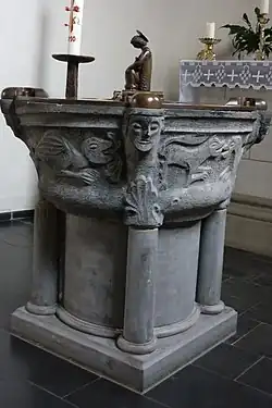 - Das Taufbecken stammt aus dem 12. Jahrhundert und ist aus Namurer Blaustein gefertigt. Es ist mit Eckmasken und Reliefdarstellungen von Ungeheuern gestaltet.