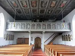 Der Innenraum des Langhauses ist mit einer Flachdecke überspannt, der des Chors mit einem Kreuzrippengewölbe. Die Wandmalereien im Chor wurden im 14. Jahrhundert ausgeführt. Dargestellt sind die Vier Evangelisten, begleitet von Engeln mit den Leidenswerkzeugen. Deckenmalerei im Langhaus stammt aus dem 17. Jahrhundert. Die Brüstung der Empore wurde 1859 mit den Aposteln bemalt. Am Hochaltar befinden sich zwei Tafelbilder, auf denen die Auferstehung Jesu Christi und die Geburt Marias dargestellt sind. Am Chorbogen ist ein Gnadenstuhl zu sehen.
