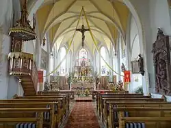 Im Inneren ist vor allem ein Epitaph aus rotem Marmor für den Adligen Alexander Leberskirchner († 1521), geschaffen von dem Bildhauer Stephan Rottaler aus Landshut, von Bedeutung. Außerdem sind eine spätgotische Pietà aus der Zeit um 1500 und ein spätromanischer Taufstein erwähnenswert.