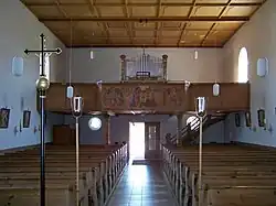 Das einschiffige Langhaus ist flachgedeckt, der eingezogene, gerade geschlossene Chor, der sich im Süden an das Langhaus anschließt, wird von einer Stichkappentonne überwölbt. Den nördlichen Abschluss des Langhauses bildet eine hölzerne Empore, die auf zwei Holzpfosten aufliegt und auf der die Weise-Orgel von 1919 eingebaut ist.