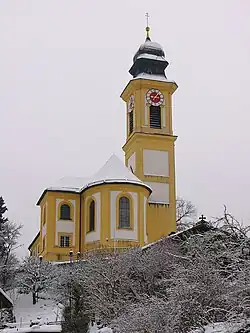 Die erstmals im Jahr 778 als oratorium erwähnte Pfarrkirche wurde in den Jahren 1729–1732 neu erbaut, wobei ein Turmunterteil eines spätgotischen Vorgängerbaus mit Gratgewölben im Erdgeschoss und Spitzbogenöffnungen zum Chor mit einbezogen wurde. Der Baumeister des 1734 geweihten Bauwerks war Johann Georg Ettenhofer aus München. Im Jahr 1954 wurde das Langhaus verlängert; eine Renovierung wurde 1976/1977 vorgenommen. Wegen herabfallendem Deckenputz musste ein Netz zum Schutz der Personen in der Kirche ausgespannt werden (Stand 2021).