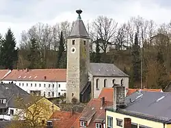 Vom romanischen Vorgängerbau ist nur noch im Osten des im 18. Jahrhundert errichteten Langhauses der mit einem Pyramidendach bedeckte Chorturm aus Bruchsteinen erhalten, mit der Sakristei im Erdgeschoss. Im obersten Geschoss befindet sich der Glockenstuhl hinter den als Biforien gestalteten Klangarkaden. Der Innenraum des Langhauses ist mit einer Flachdecke überspannt. Zur Kirchenausstattung gehört ein in der Zeit des Rokoko entstandener, von Säulen flankierter Altar mit einem sehenswerten Antependium, auf dessen Altarretabel der heilige Georg dargestellt ist. Die Predella und der Tabernakel wurden erst später hinzugefügt. Im Altarauszug ist der heilige Laurentius zu sehen. An der westlichen Langhauswand befinden sich Epitaphien aus dem 16.–19. Jahrhundert.