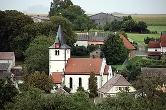 Die spätromanische Saalkirche wurde im 13. Jahrhundert erbaut. Sie besteht aus einem Langhaus und einem Chorturm im Osten. Dieser ist mit einem achtseitigen Knickhelm bedeckt, dessen Südseite eine Dachgaube mit dem Zifferblatt der Turmuhr trägt. Hinter den als Biforien gestalteten Klangarkaden befindet sich der Glockenstuhl.