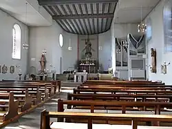 Die ursprüngliche Kirche vom Anfang des 13. Jahrhunderts war ein einschiffiger Gewölbebau mit leicht eingezogenem, quadratischen Chor. Aus dieser Zeit stammt auch der Westturm. Auf einer Inschrifttafel wird für 1663 die Wiederherstellung des Gebäudes bekundet. Eine Erweiterung nach Süden wurde 1936 und 1937 durch Josef Lucas vorgenommen. Das Nordportal ist wohl aus Fragmenten zusammengesetzt. Ein gerader Sturz zeigt Christus und die Apostel als rohes romanisches Relief. Die Kragsteine sind zwei liegende Löwen mit menschlichen Figuren zwischen den Tatzen. Zwei ähnliche Tierreliefs befinden sich an der Ostseite des Chores.[1]