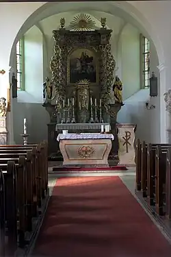 Die Orgel stammt aus der Barockzeit. Die genaue Entstehungszeit ist unbekannt. Sie steht seit der Kirchenweihe 1718 in dem Gotteshaus. Der fünfteilige Orgelprospekt mit einem hohen Mittelteil besteht aus marmoriertem Holz mit vergoldetem Muschelwerk- und Blumendekor.[6] Der Mallersdorfer Orgelbaumeister Paul Rohner restaurierte 1986/1987 das Instrument und ergänzte drei fehlende Register. Seitdem hat die Orgel acht Register auf einem Manual und Pedal.[7]