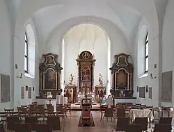 In einem Gemälde von Johann Baptist Neumüller ist im linken Seitenaltar die heilige Klara dargestellt. Auf dem rechten Seitenaltar steht statt eines Gemäldes eine Marienstatue mit textilem Gewand vor einem flammenden Strahlenhintergrund.[2]