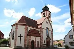 Die neobarocke, mit Pilastern gegliederte Saalkirche wurde 1914 erbaut. Sie besteht aus einem Langhaus, das von einem Querschiff geteilt wird, einem eingezogenen Chor im Westen und dem Kirchturm an der Nordseite des Langhauses gegenüber der Kapelle, dem Chor des Vorgängerbaus von 1773. Das oberste Geschoss des Kirchturms, dessen Ecken abgeschrägt sind, beherbergt die Turmuhr und den Glockenstuhl, in dem vier Kirchenglocken[1] hängen. Darauf sitzt eine kugelförmige Haube. Die Orgel mit 22 Registern, 2 Manualen und einem Pedal wurde 1939 von Johannes Klais Orgelbau errichtet.[2]