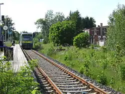 - Die Insel-Schokoladen- und Zuckerwarenfabrik wurde 1910 jenseits des Bahnhofsgeländes errichtet und erhielt einen eigenen Gleisanschluss. 1944 wurde sie vorübergehend als Zweigwerk einer Creußener Rüstungsfabrik zum „Inselbetrieb Carl Tabel“, wo 102 Gefangene aus dem Zuchthaus St. Georgen Zwangsarbeit leisten mussten. In den 1960er Jahren wurde die Produktion eingestellt.[62] Das Gebäude beherbergt heute das Jugendzentrum „Schoko“ und ist ein Industriedenkmal.[63]