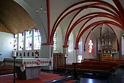 Dem Westturm wurde 1759 ein neuer, kreuzrippengewölbter Saalbau angefügt, der 1875 um zwei Achsen und den Chor nach Osten verlängert wurde. Die drei westlichen Achsen wurden 1965/66 niedergelegt und an ihrer Stelle östlich an den Turm eine Art Querhaus als Erweiterungsbau errichtet.