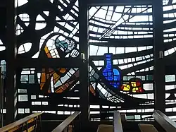 Die beiden Glas-Beton-Giebel zeigen biblische Motive. Das Mosaik zur Südseite/Straße zeigt die Speisung des Propheten Elia in der Wüste (1 Kön 19,4 ). Das Fenster zur Nordseite zeigt den Traum Jakobs (Jakobsleiter) (Gen 28,11 ).