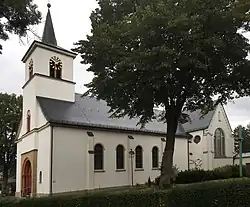 Es handelt sich um eine Saalkirche mit eingezogenem Turm, die durch ein Querhaus und einen Chorraum erweitert wurde. Das verputzte Bauwerk ist schiefergedeckt. Die Seitenwände des älteren Teils weisen schlichte rundbogige Fenster auf, während die Querhausgiebel mit den großen gegliederten Fenstern von der Neogotik beeinflusst sind.