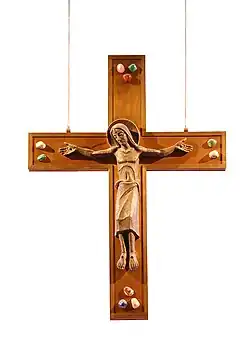 Das schlichte lateinische Holzkreuz ist mit Bronzeblech verkleidet. Die Balken werden von Rahmenleisten eingefasst. An den Balkenenden sind jeweils zwei bzw. drei Halbedelsteine in schlichten Fassungen montiert (Amethyst, Opal, Rosenquarz und Bergkristall). Der Korpus ist aus massiver Gussbronze. Christus ist mit vier Nägeln an das Kreuz geschlagen. Der Körper ist aufrecht, der Kopf leicht zur Seite geneigt. Augen und Mund sind geschlossen. Der Körper ist kantig, die Darstellung schematisiert. Das knielange Lendentuch liegt eng am Körper an und ist nur durch wenige, flache Falten gegliedert. Die Rückseite des Kreuzes ist schlicht und glatt poliert.