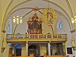- Die Doppelmadonna ist von einem Strahlenkranz umgeben, sie hängt im Gewölbejoch vor der Orgelbühne und stammt aus der Zeit um 1670. Die Madonna hat das Jesuskind auf dem Arm, welches die Weltkugel präsentiert. Mit ihren Füßen zertritt sie auf der Mondsichel einer Schlange den Kopf. Im unteren Teil blicken Engelsköpfe zwischen Wolken den Betrachter an. Den Abschluss nach unten bildet ein aufgesprungener Granatapfel, er symbolisiert das Leben.