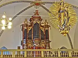 Die Orgelempore vor den Arkaden der Westwand wird durch toskanische Säulen gestützt. Der Prospekt von Andreas Schneider(1684) erhebt sich hinter einer Brüstung mit Balustern, er wurde in der zweiten Hälfte des 17. Jahrhunderts in barocken Formen gebaut. Auf dem mittleren Pfeifenturm prangt das Gesamtwappen des Fürstbischofs Ferdinand, es ist von einem Fürstenhut bekrönt. Der Prospekt ist in Rot und Gold gefasst und mit prächtigem Blattwerk, Füllhörnern, Cherubenköpfen und Fruchtgebinden geschmückt. Die beiden Spitztürme an den Außenseiten werden von Atlanten getragen.[5] Das Orgelwerk mit 18 Registern, verteilt auf zwei Manuale und Pedal, wurde 1928 von Franz Eggert erneuert.[10]