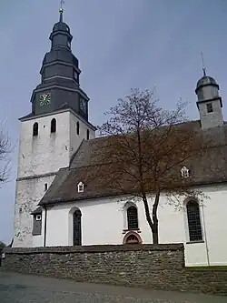 Unter den Stadtbränden, durch welche die Kirche stark beschädigt wurde, war der schlimmste der vom Jahr 1519. Unabhängig davon wurde der quadratische Turm im Westen der Kirche 1708/09 auf einem alten Sockel neu errichtet. Abgeschlossen wird er von einer dreifach gestuften, achtseitigen Barockhaube, einem Werk des Hallenberger Meisters Konrad Hesse, der auch Arbeiten in Eversberg, Wormbach und Hesborn durchführte. Über den beiden Ecken des Chors finden sich auf dem Kirchendach kleinere Entsprechungen des Hauptturmes. Die quadratische Grundfläche des Turms ist nur wenig kleiner als die Grundfläche des Chors und ist etwa 6 Meter mal 6 Meter groß.