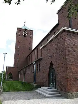 Der Kirchenbau ist in moderner, schlichter, expressionistisch beeinflusster Formensprache gehalten. Das Gebäude hat drei Schiffe: ein breites Mittelschiff unter einem Walmdach und zwei niedrige Seitenschiffe unter Pultdächern. Das nördliche Seitenschiff ist kürzer als das südliche und geht in den Glockenturm der Kirche über, der an das Mittelschiff angebaut ist. Besonders prägnant ist das Backstein-Sichtmauerwerk.