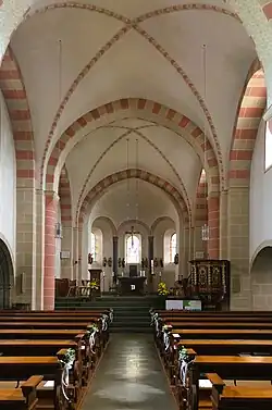 Das Gebäude ist ein dreijochiger, einschiffiger, romanischer Gewölbebau. Es wurde aus Bruchstein gemauert. Der einjochige Chor mit halbrunder Apsis ist erhöht. Er wurde mit Kreuzgratgewölben ausgestattet. Die zweijochigen Nebenchöre mit Apsiden wirken in der Außenansicht wie Fragmente von Seitenschiffen. Auf der Südseite wurde später eine Sakristei angebaut. Durch einen Umbau im 13. Jahrhundert wurde die ursprünglich flach gedeckte Kirche eingewölbt. Der wuchtige Turm im Westen der Kirche ist ungegliedert.