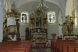 Die barocke Saalkirche besitzt einen Glockenturm mit Zwiebelhelm und Laterne. Das Altargemälde zeigt den hl. Hyazinth. Auf dem Kirchhof befindet sich eine Nachbildung der Grotte von Lourdes. Umgeben ist die Kirche von einer steinernen Mauer.