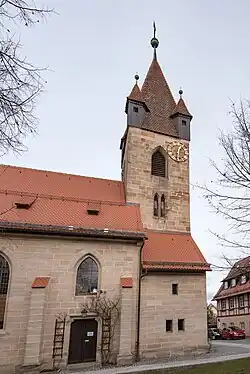 Die Saalkirche wurde aus Quadermauerwerk gebaut. Die unteren Geschosse des Chorturms auf quadratischem Grundriss stammen aus der zweiten Hälfte des 14. Jahrhunderts. Sein oberstes Geschoss beherbergt die Turmuhr und den Glockenstuhl, in dem drei Kirchenglocken[7] hängen. Zwischen den Scharwachttürmen an den Ecken erhebt sich ein Pyramidendach. Das an ihn 1849/50 angefügte Langhaus, dessen Wände von Strebepfeilern gestützt werden, wurde 1950/51 nach Kriegsschäden erneuert. Zur Kirchenausstattung gehört ein Altar, auf dem ein Leuchterengel von Jacob Daniel Burgschmiet steht, den er für die Lorenzkirche in Nürnberg geschaffen hat. Die Orgel mit 19 Registern, zwei Manualen und einem Pedal wurde 1953 von der E. F. Walcker & Cie. gebaut.[8]