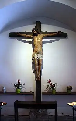 Bei dem heute in der nördlichen Vorhalle der St. Georgskirche aufgestellten Kruzifix geht man davon aus, dass das Kreuz aus der benachbarten Pfarrkirche St. Jakob stammt und im Zuge des Abrisses dieser Kirche nach St. Georg gelangte.[7] Es ist eines der wenigen noch vorhandenen Kunstobjekte der niedergelegten Kirche.