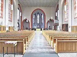 Die mit der Apsis nach Norden ausgerichtete Kirche war ursprünglich eine dreischiffige neogotische Stufenhalle mit Portalturm im Süden, wenig ausladendem Querschiff, eingezogenem Chorraum mit Chorjoch und dreiseitigem Schluss. Spitzbogenarkaden auf schlanken Rundpfeilern teilten die Schiffe des dreijochigen Langhauses. Die Vierung wurde durch Pfeiler aus vier Halbsäulen mit polygonalen Kämpferplatten betont. Die Joche waren kreuzgewölbt.