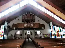 Der neue Kirchenbau mit innen sichtbarem zeltartigen Dach ist an die Südseite des Kirchenschiffs der alten Kirche quer zu diesem angebaut und durch offene Rundbögen mit dem alten Langhaus verbunden. Während die alte Kirche geostet ist, ist der neue Kirchenraum auf den Altar im Süden ausgerichtet. An der Südseite ist auch eine Sakristei mit eigenständigem Pyramidendach angebaut.