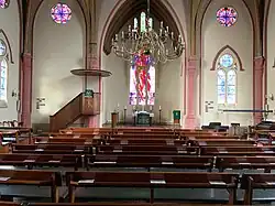 Der fast quadratische Innenraum wird von einer Holzdecke überspannt. Der kleine Altar wurde zentral im Chor angeordnet.