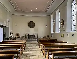 Die Wände des schlichten verputzten Gebäudes sind durch Rundbogenfenster gegliedert, unter der profilierten Traufe umläuft ein Fries die Kirche. Das Eingangsportal ist von einer Putzquaderung umrahmt, wilde Männer halten das Preußische Wappen, das bekrönt ist.[2] Im stichbogig geschlossenen Raum ruht eine Spiegeldecke über Voute.[3]