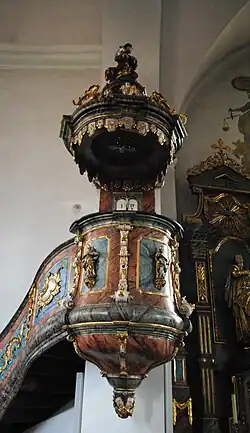 Die von Ignaz Spennkuch aus Kitzingen und Kaspar Fromm aus Wiesentheid gearbeitete Kanzel stammt aus dem Rokoko und wurde im Jahr 1762 in die Kirche gebracht. Sie befindet sich am Übergang vom Langhaus in die nördliche Rotunde. Ein reich verziertes Gitter begrenzt den unteren Abschnitt des Aufgangs. Darüber beginnt ein aus Marmor gearbeitetes Geländer mit goldenen Stuckelementen. Der Kanzelkorb schließt unten mit einigen Puttenköpfen ab. Darüber befinden sich drei Heiligenfiguren. Dargestellt sind die Bischöfe St. Bruno (links), St. Kilian (Mitte) und möglicherweise der heilige Burkard, der erste Bischof von Würzburg (rechts). Alle Figuren entstammen Zunftstangen, die bei Prozessionen im Dorf vorangetragen wurden.[5] Den Übergang zum Schalldeckel bilden die Gesetzestafeln der zehn Gebote. Der Schalldeckel selbst wird von einer Figur des Guten Hirten bekrönt, eine Taube hängt unten im Schalldeckel.