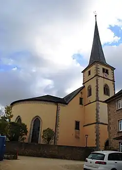 Die Kirche, ursprünglich als spätgotischer Saalbau im 16. und 17. Jahrhundert errichtet, wurde im 19. Jahrhundert mit zwei halbrunden Anbauten versehen, die das Kirchengebäude breiter als lang erscheinen lassen. Es ist geostet, in einem Westturm befindet sich das Hauptportal.