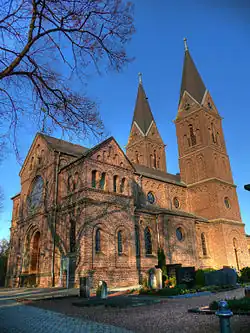 St. Jakobus ist eine reich gegliederte Backsteinbasilika im Baustil der Neuromanik in Südwest-Nordost-Ausrichtung. Im Südwesten besitzt sie eine zweigeschossige Vorhalle, die einem Querhaus ähnelt, sowie im Nordosten einen fünfseitig geschlossenen Chor. Dieser wird von ca. 48 Meter hohen und viergeschossigen Zwillingstürmen, von denen jedoch nur einer die Glocken birgt, flankiert. Zwischen Chor und Westvorbau erstreckt sich das dreijochige Langhaus. Das Mittelschiff ist im Innern 6 Meter breit und die Seitenschiffe sind im ersten und dritten Joch 2,30 Meter breit. Das mittlere Joch der Seitenschiffe ist etwas breiter. Der gesamte Innenraum ist mit Kreuzrippen- und Kreuzgratgewölben überwölbt. Die Arkaden zwischen Mittel- und Seitenschiffen werden durch Säulen aus poliertem, roten Granit unterteilt. Insgesamt ist das Bauwerk 30,50 Meter lang und 16 Meter breit.[7]