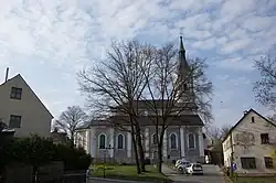 Die Staffelhalle wurde 1849/50 erbaut, nachdem der Vorgängerbau 1846 abgebrannt war. Sie besteht aus einem Langhaus mit drei Kirchenschiffen, einem dreiseitig geschlossenen Chor im Osten des Mittelschiffs und einem Fassadenturm im Westen, der nur leicht aus der Fassade mit fünf Achsen hervortritt. Seine unteren Geschosse stammen bis zum Ansatz des Helms aus der ersten Hälfte des 18. Jahrhunderts. Der Putz ist mit Pilastern und Lisenen gegliedert. Das oberste Geschoss beherbergt die Turmuhr und den Glockenstuhl, in dem vier Kirchenglocken[1] hängen. Darauf sitzt ein Helm, der mit einer Laterne bekrönt ist.
